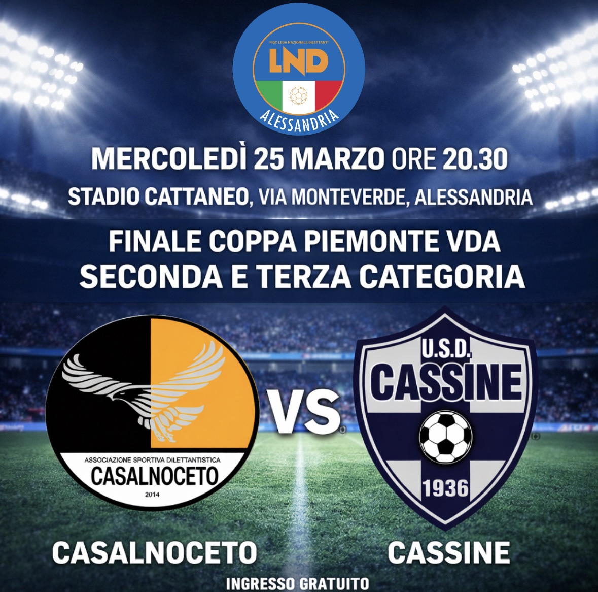 Si disputerà mercoledì 25 marzo alle ore 20.30, presso lo stadio “Renato Cattaneo” di Alessandria, la finale della Coppa Piemonte Valle d’Aosta di Seconda e Terza Categoria – fase provinciale di Alessandria.